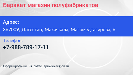 Баракат, магазин полуфабрикатов по адресу 367009, Дагестан, Махачкала, Магомедтагирова, 6 в дальнейшем Организация, размещена в следующих категориях: