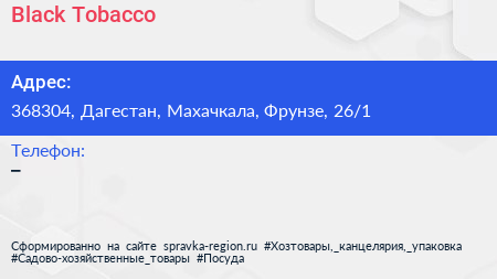 Black Tobacco по адресу 368304, Дагестан, Махачкала, Фрунзе, 26/1 в дальнейшем Организация, размещена в следующих категориях: