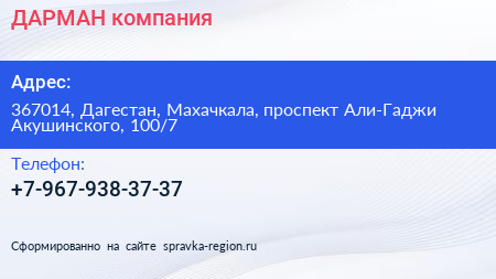 ДАРМАН, компания по адресу 367014, Дагестан, Махачкала, проспект Али-Гаджи Акушинского, 100/7 в дальнейшем Организация, размещена в следующих категориях: