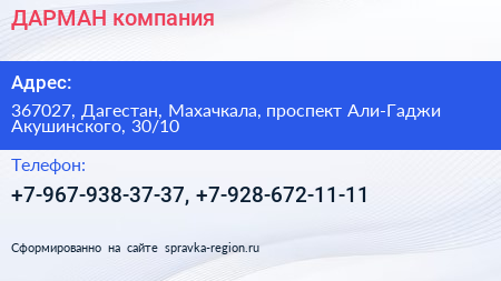 ДАРМАН, компания по адресу 367027, Дагестан, Махачкала, проспект Али-Гаджи Акушинского, 30/10 в дальнейшем Организация, размещена в следующих категориях: