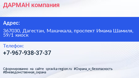 ДАРМАН, компания по адресу 367030, Дагестан, Махачкала, проспект Имама Шамиля, 59/1 киоск в дальнейшем Организация, размещена в следующих категориях: