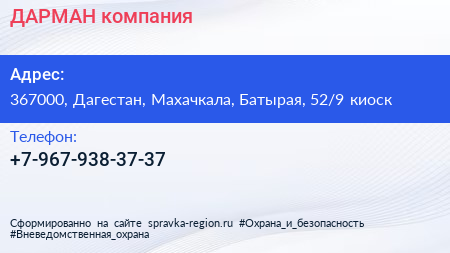 ДАРМАН, компания по адресу 367000, Дагестан, Махачкала, Батырая, 52/9 киоск в дальнейшем Организация, размещена в следующих категориях: