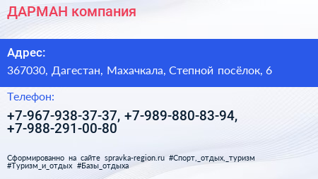 Для связи с организацией воспользуйтесь номером телефона: +7-967-938-37-37, +7-989-880-83-94, +7-988-291-00-80. Ежедневно с 08:00 до 18:00, вы можете обратиться в эту организацию.