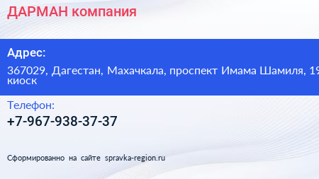 ДАРМАН, компания по адресу 367029, Дагестан, Махачкала, проспект Имама Шамиля, 19 киоск в дальнейшем Организация, размещена в следующих категориях: