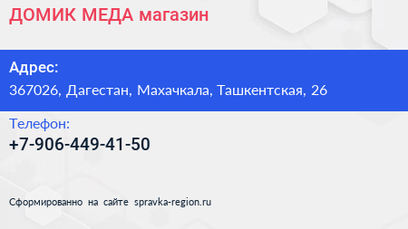 ДОМИК МЕДА, магазин по адресу 367026, Дагестан, Махачкала, Ташкентская, 26 в дальнейшем Организация, размещена в следующих категориях: