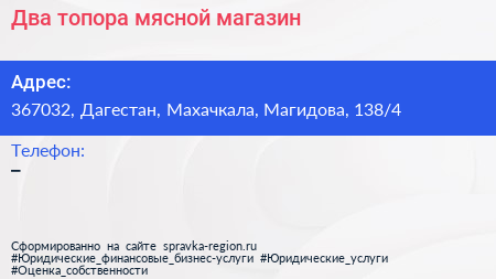 Два топора, мясной магазин по адресу 367032, Дагестан, Махачкала, Магидова, 138/4 в дальнейшем Организация, размещена в следующих категориях: