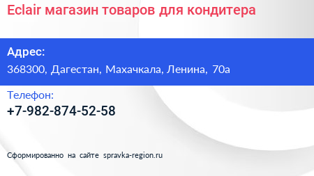 Eclair, магазин товаров для кондитера по адресу 368300, Дагестан, Махачкала, Ленина, 70а в дальнейшем Организация, размещена в следующих категориях:
