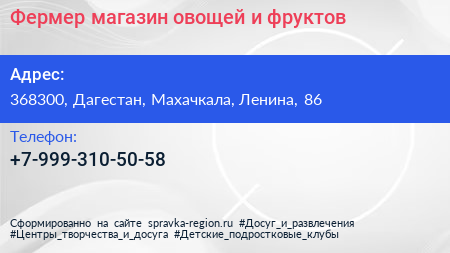 Фермер, магазин овощей и фруктов по адресу 368300, Дагестан, Махачкала, Ленина, 86 в дальнейшем Организация, размещена в следующих категориях: