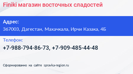 Finiki, магазин восточных сладостей по адресу 367003, Дагестан, Махачкала, Ирчи Казака, 4Б в дальнейшем Организация, размещена в следующих категориях: