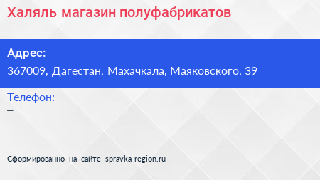 Халяль, магазин полуфабрикатов по адресу 367009, Дагестан, Махачкала, Маяковского, 39 в дальнейшем Организация, размещена в следующих категориях: