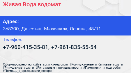 Живая Вода, водомат по адресу 368300, Дагестан, Махачкала, Ленина, 48/11 в дальнейшем Организация, размещена в следующих категориях: