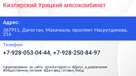 Кизлярский Урицкий мясокомбинат по адресу 367911, Дагестан, Махачкала, проспект Насрутдинова, 216 в дальнейшем Организация, размещена в следующих категориях: