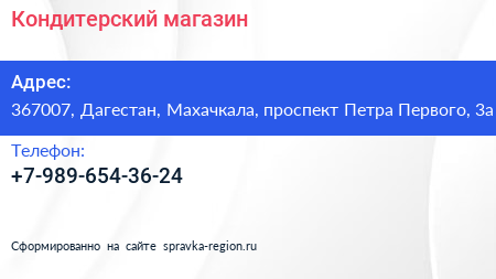 Кондитерский магазин по адресу 367007, Дагестан, Махачкала, проспект Петра Первого, 3а в дальнейшем Организация, размещена в следующих категориях:
