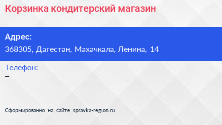 Корзинка, кондитерский магазин по адресу 368305, Дагестан, Махачкала, Ленина, 14 в дальнейшем Организация, размещена в следующих категориях: