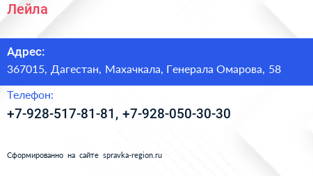 Лейла по адресу 367015, Дагестан, Махачкала, Генерала Омарова, 58 в дальнейшем Организация, размещена в следующих категориях: