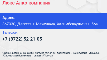 Люкс-Алко, компания по адресу 367030, Дагестан, Махачкала, Халимбекаульская, 56а в дальнейшем Организация, размещена в следующих категориях: