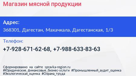 Магазин мясной продукции по адресу 368301, Дагестан, Махачкала, Дагестанская, 1/3 в дальнейшем Организация, размещена в следующих категориях: