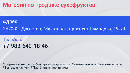 Магазин по продаже сухофруктов по адресу 367030, Дагестан, Махачкала, проспект Гамидова, 49а/1 в дальнейшем Организация, размещена в следующих категориях:
