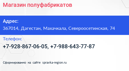 Магазин полуфабрикатов по адресу 367014, Дагестан, Махачкала, Североосетинская, 74 в дальнейшем Организация, размещена в следующих категориях: