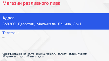 Магазин разливного пива по адресу 368300, Дагестан, Махачкала, Ленина, 36/1 в дальнейшем Организация, размещена в следующих категориях: