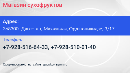 Магазин сухофруктов по адресу 368300, Дагестан, Махачкала, Орджоникидзе, 3/17 в дальнейшем Организация, размещена в следующих категориях: