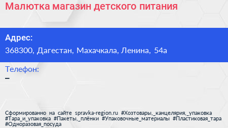 Малютка, магазин детского питания по адресу 368300, Дагестан, Махачкала, Ленина, 54а в дальнейшем Организация, размещена в следующих категориях: