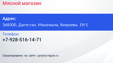 Мясной магазин по адресу 368300, Дагестан, Махачкала, Хизроева, 19/1 в дальнейшем Организация, размещена в следующих категориях: