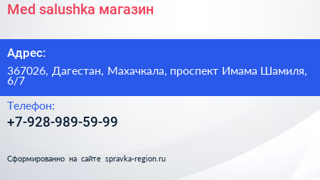 Med salushka, магазин по адресу 367026, Дагестан, Махачкала, проспект Имама Шамиля, 6/7 в дальнейшем Организация, размещена в следующих категориях: