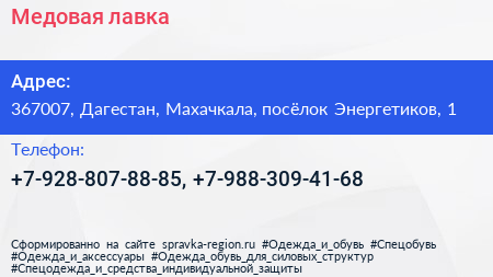 Медовая лавка по адресу 367007, Дагестан, Махачкала, посёлок Энергетиков, 1 в дальнейшем Организация, размещена в следующих категориях:
