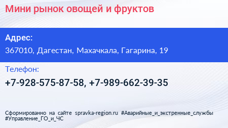 Мини-рынок овощей и фруктов по адресу 367010, Дагестан, Махачкала, Гагарина, 19 в дальнейшем Организация, размещена в следующих категориях: