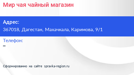 Мир чая, чайный магазин по адресу 367018, Дагестан, Махачкала, Каримова, 9/1 в дальнейшем Организация, размещена в следующих категориях: