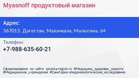 Myasnoff, продуктовый магазин по адресу 367013, Дагестан, Махачкала, Малыгина, 64 в дальнейшем Организация, размещена в следующих категориях: