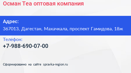 Осман Tea, оптовая компания по адресу 367013, Дагестан, Махачкала, проспект Гамидова, 18ж в дальнейшем Организация, размещена в следующих категориях: