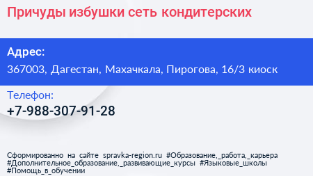 Причуды избушки, сеть кондитерских по адресу 367003, Дагестан, Махачкала, Пирогова, 16/3 киоск в дальнейшем Организация, размещена в следующих категориях: