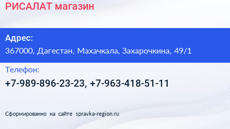 РИСАЛАТ, магазин по адресу 367000, Дагестан, Махачкала, Захарочкина, 49/1 в дальнейшем Организация, размещена в следующих категориях: