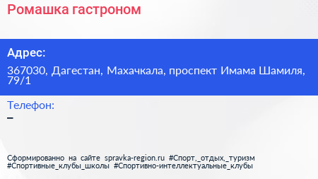 Ромашка, гастроном по адресу 367030, Дагестан, Махачкала, проспект Имама Шамиля, 79/1 в дальнейшем Организация, размещена в следующих категориях: