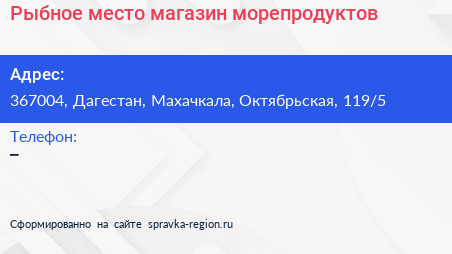 Рыбное место, магазин морепродуктов по адресу 367004, Дагестан, Махачкала, Октябрьская, 119/5 в дальнейшем Организация, размещена в следующих категориях: