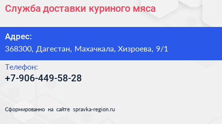 Служба доставки куриного мяса по адресу 368300, Дагестан, Махачкала, Хизроева, 9/1 в дальнейшем Организация, размещена в следующих категориях: