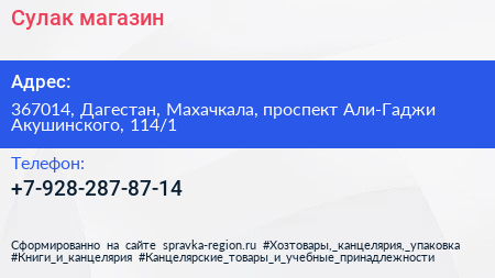 Сулак, магазин по адресу 367014, Дагестан, Махачкала, проспект Али-Гаджи Акушинского, 114/1 в дальнейшем Организация, размещена в следующих категориях: