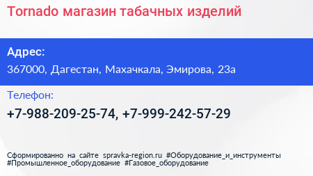 Tornado, магазин табачных изделий по адресу 367000, Дагестан, Махачкала, Эмирова, 23а в дальнейшем Организация, размещена в следующих категориях: