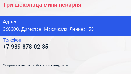 Три шоколада, мини-пекарня по адресу 368300, Дагестан, Махачкала, Ленина, 53 в дальнейшем Организация, размещена в следующих категориях: