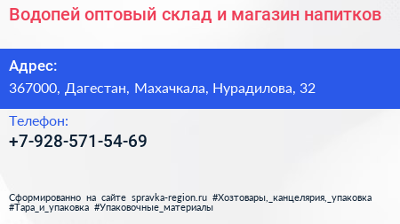 Водопей, оптовый склад и магазин напитков по адресу 367000, Дагестан, Махачкала, Нурадилова, 32 в дальнейшем Организация, размещена в следующих категориях:
