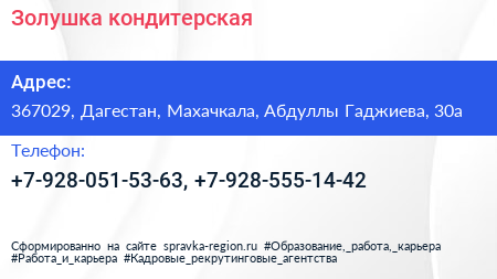 Золушка, кондитерская по адресу 367029, Дагестан, Махачкала, Абдуллы Гаджиева, 30а в дальнейшем Организация, размещена в следующих категориях: