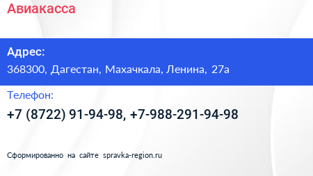 Авиакасса по адресу 368300, Дагестан, Махачкала, Ленина, 27а в дальнейшем Организация, размещена в следующих категориях: