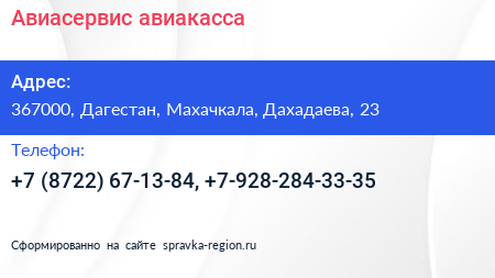 Авиасервис, авиакасса по адресу 367000, Дагестан, Махачкала, Дахадаева, 23 в дальнейшем Организация, размещена в следующих категориях: