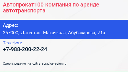 Автопрокат100, компания по аренде автотранспорта по адресу 367000, Дагестан, Махачкала, Абубакарова, 71а в дальнейшем Организация, размещена в следующих категориях: