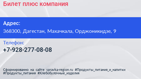 Билет плюс, компания по адресу 368300, Дагестан, Махачкала, Орджоникидзе, 9 в дальнейшем Организация, размещена в следующих категориях: