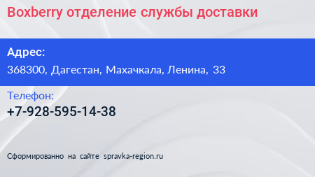 Boxberry, отделение службы доставки по адресу 368300, Дагестан, Махачкала, Ленина, 33 в дальнейшем Организация, размещена в следующих категориях: