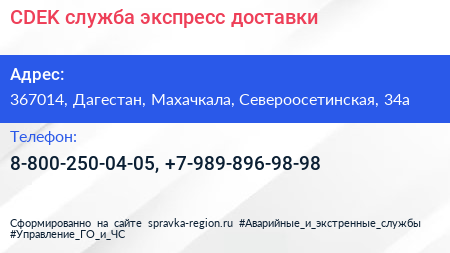 CDEK, служба экспресс-доставки по адресу 367014, Дагестан, Махачкала, Североосетинская, 34а в дальнейшем Организация, размещена в следующих категориях: