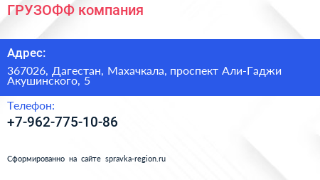 ГРУЗОФФ, компания по адресу 367026, Дагестан, Махачкала, проспект Али-Гаджи Акушинского, 5 в дальнейшем Организация, размещена в следующих категориях: